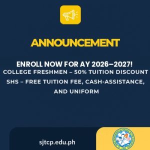 Pursuant to the directive issued by Malacañang, work and classes at all levels in SJTCP are suspended on Wednesday, July 23, 2025, due to the persistent heavy rainfall brought by the southwest monsoon (Habagat).Please stay safe.